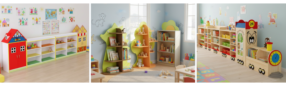 Безопасные и яркие стеллажи для детского сада с быстрой доставкой!