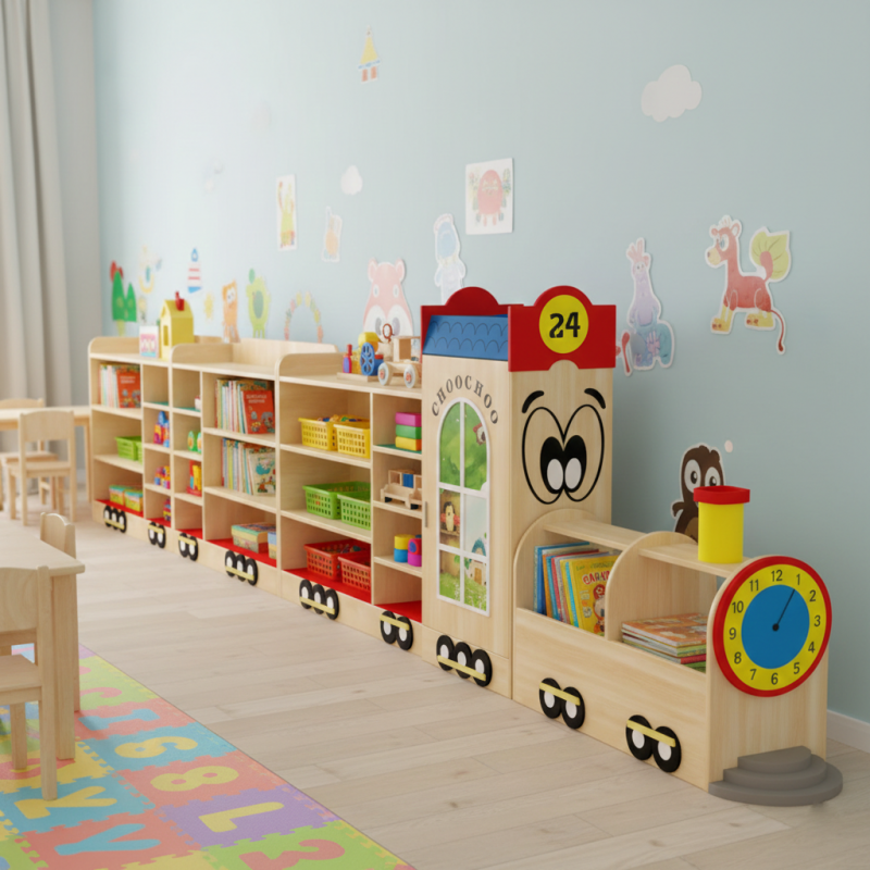 - Стеллаж выполнен в виде поезда и состоит из нескольких секций с открытыми полками.