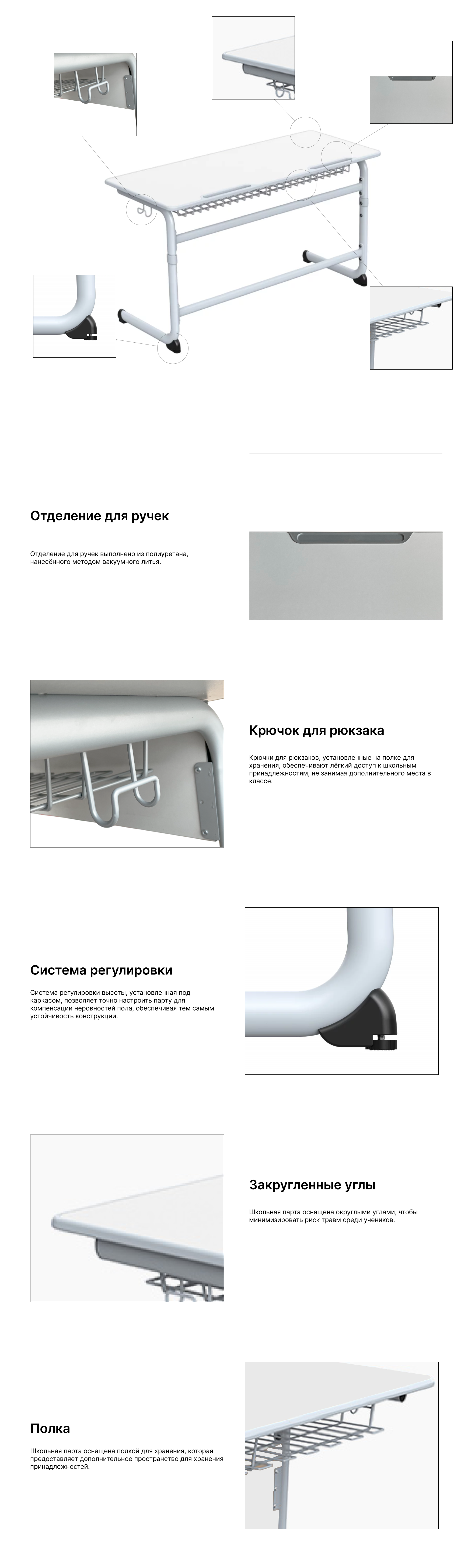 - Парта оснащена полкой для хранения вещей и крючками на каждой боковой стороне каркаса для рюкзака