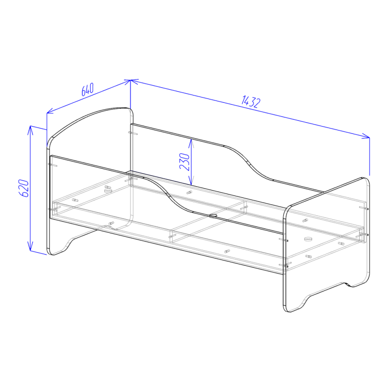 - Леглото е оборудвано с пластмасови крачета.