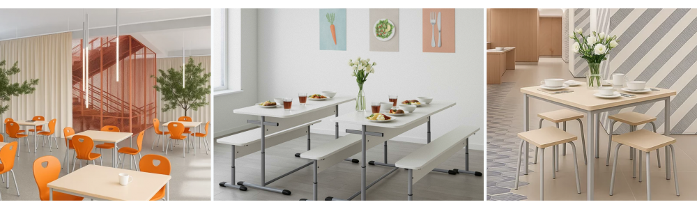 Маси, пейки и табуретки за трапезарията са важни елементи за образователните институции, към избора на които трябва да се подхожда отговорно и правилно. Мебелите за хранене трябва не само да гарантират удобство и многосменна експлоатация, но и комфортно удоволствие от приема на храна.
