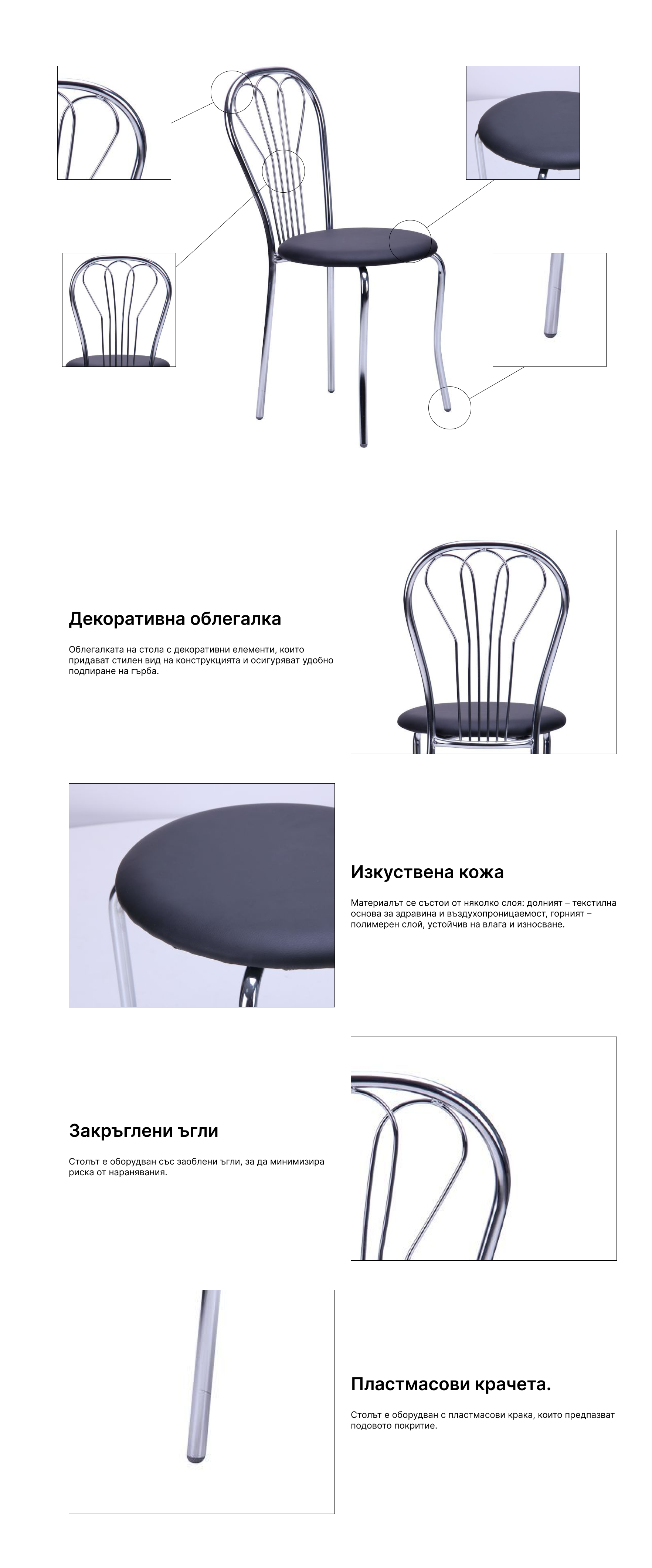 - Седалката е изработена от шперплат и е тапицирана с износоустойчива PVC изкуствена кожа с дебелина 0,7 мм.