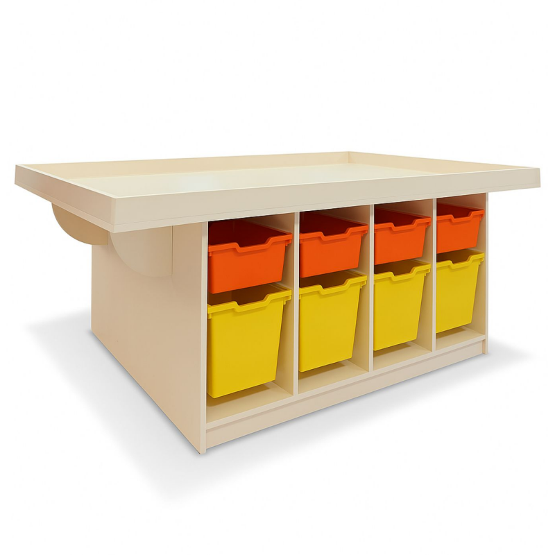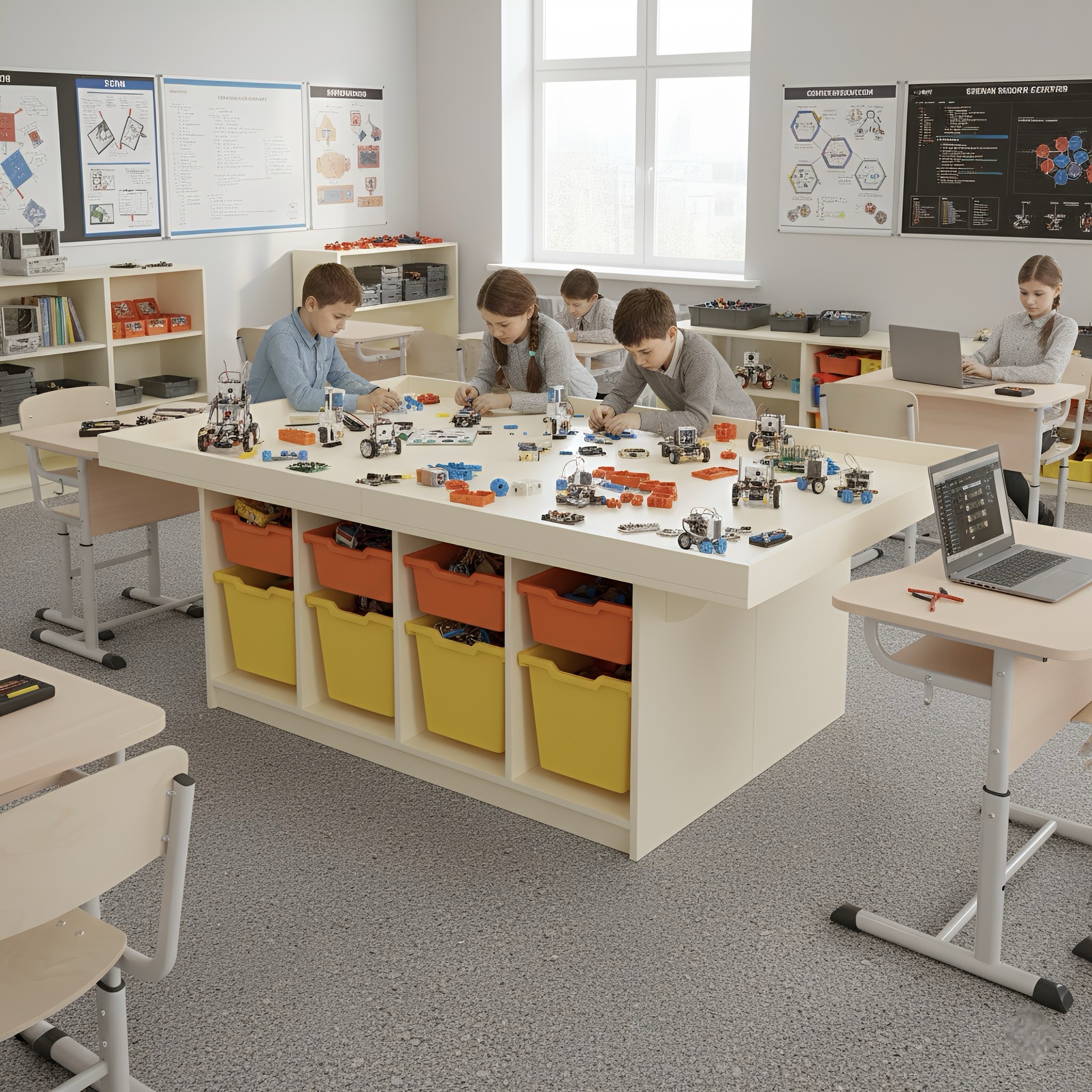 - Масата е предназначена за съхранение на учебни материали, електронни компоненти и инструменти директно в работната зона.