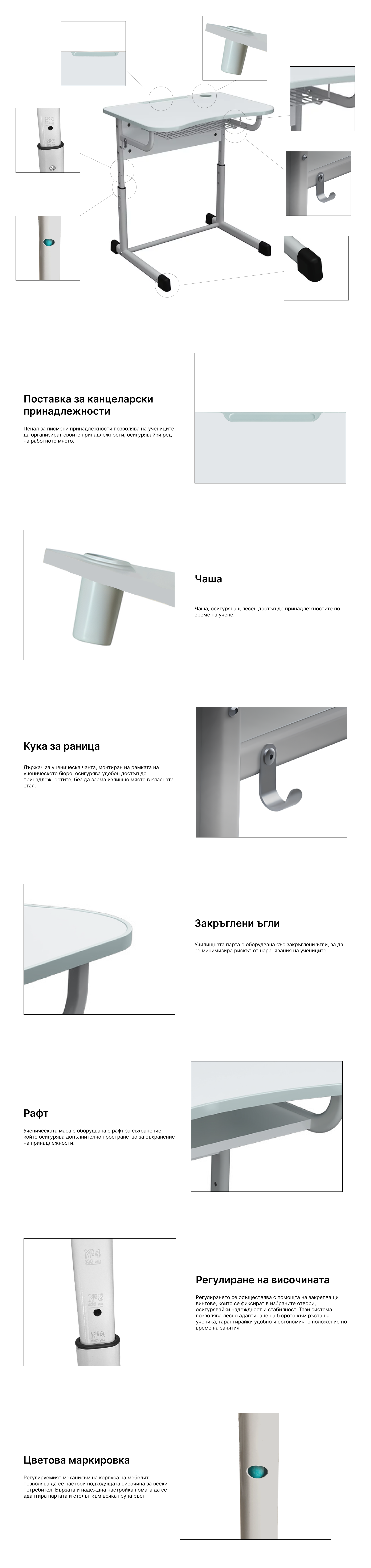 - Ученическият чин е оборудван с рафт за съхранение на вещи и кука отстрани на рамката за раница.