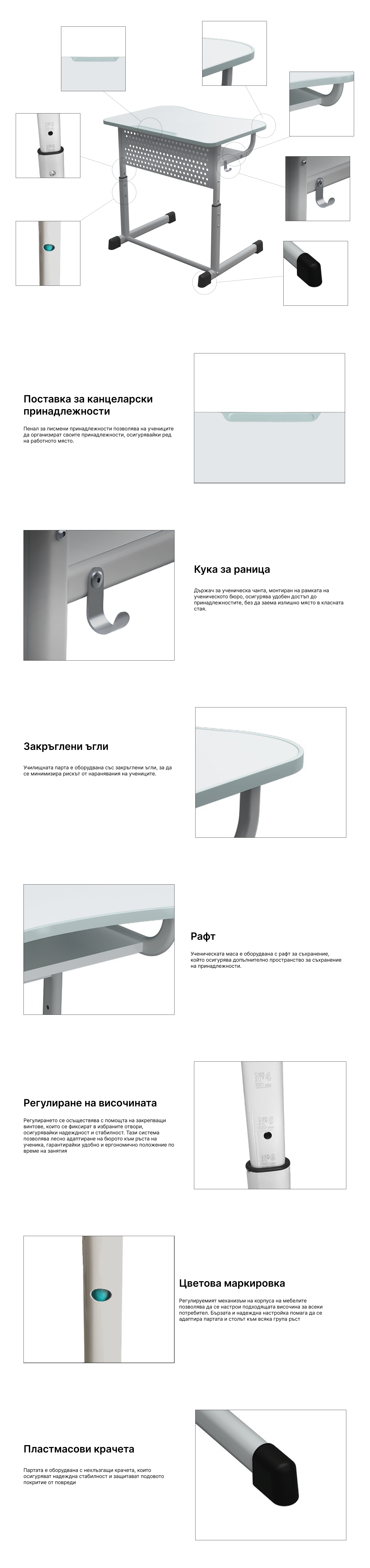 - Ученическото бюро е оборудвано с полица за съхранение на вещи и с кука отстрани на рамката за раница.