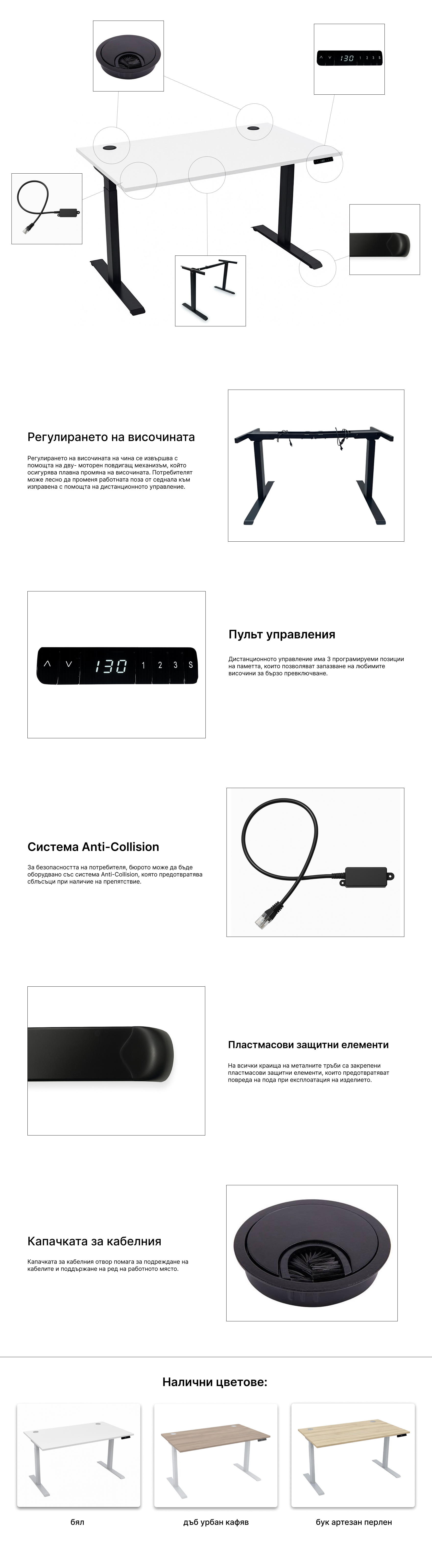 - Регулирането на височината на бюрото се извършва с двоен моторен механизъм, който осигурява плавно регулиране на височината.