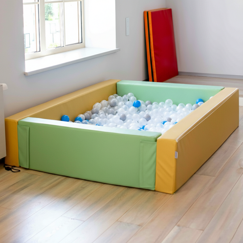 Сухой бассейн "Прямоугольник" представляет собой конструкцию прямоугольной формы, которая состоит из дна и толстых мягких стенок, которые соединяются липучками.