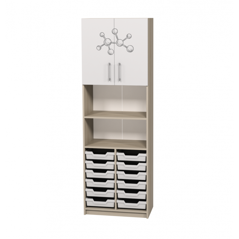 - Dulapul are 4 rafturi, dintre care 2 sunt închise. Este prevăzută reglarea înălțimii rafturilor individuale. De asemenea, este prevăzută instalarea a 12 cutii de depozitare din plastic glisante de producție proprie, de culoare gri.