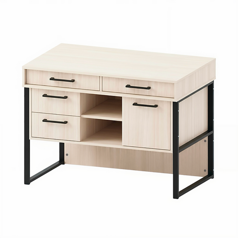 - Corpul lateral este format din trei compartimente: în partea stângă se află două sertare pe ghidaje cu bile, în centru — un raft deschis, iar în partea dreaptă — un compartiment cu raft, închis cu ușă.