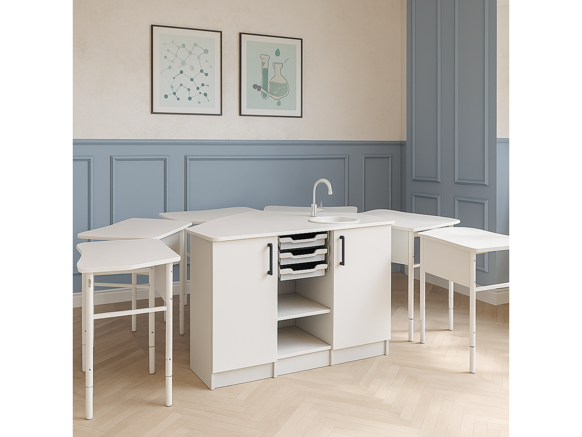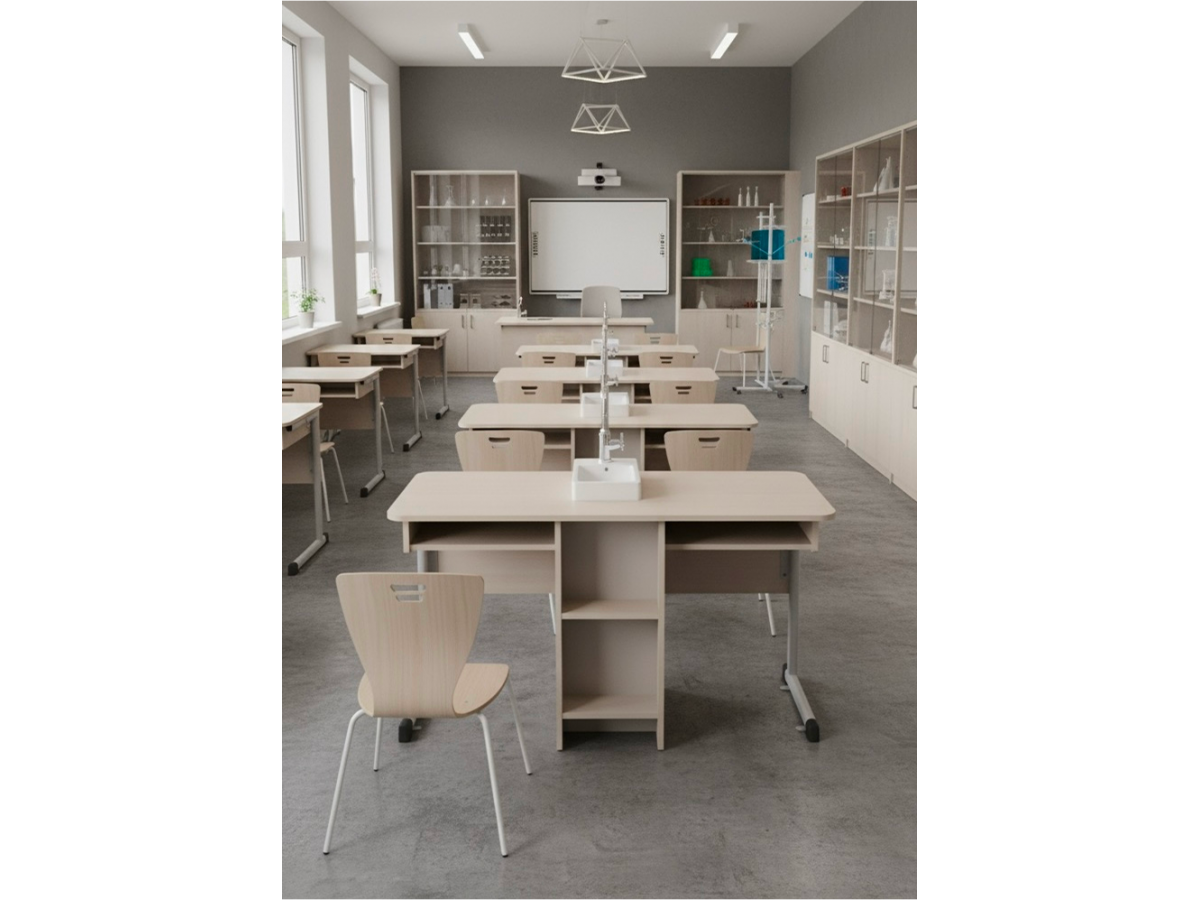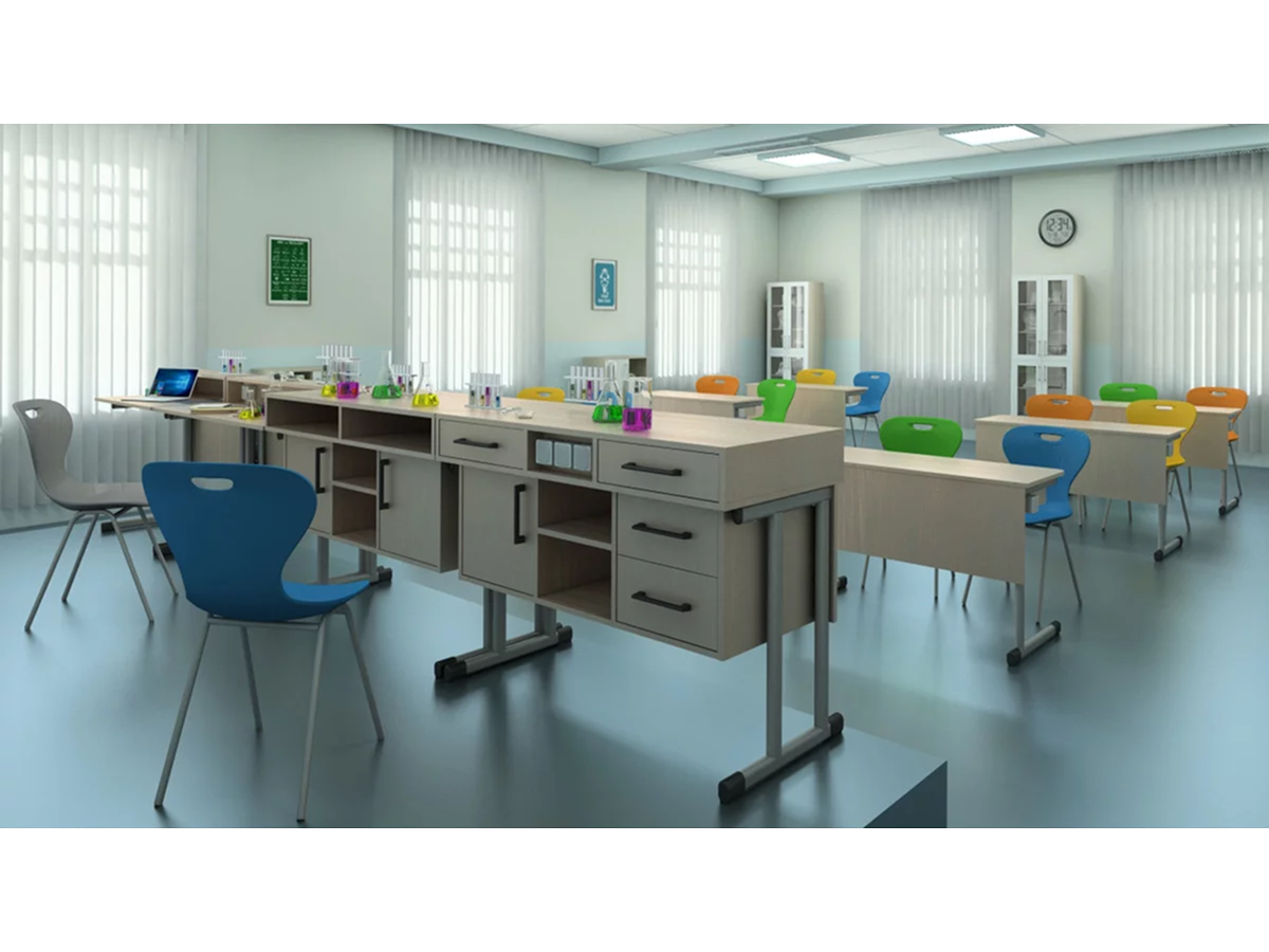 Просторные рабочие поверхности и удобное расположение мебели способствуют комфортному проведению лабораторных работ.