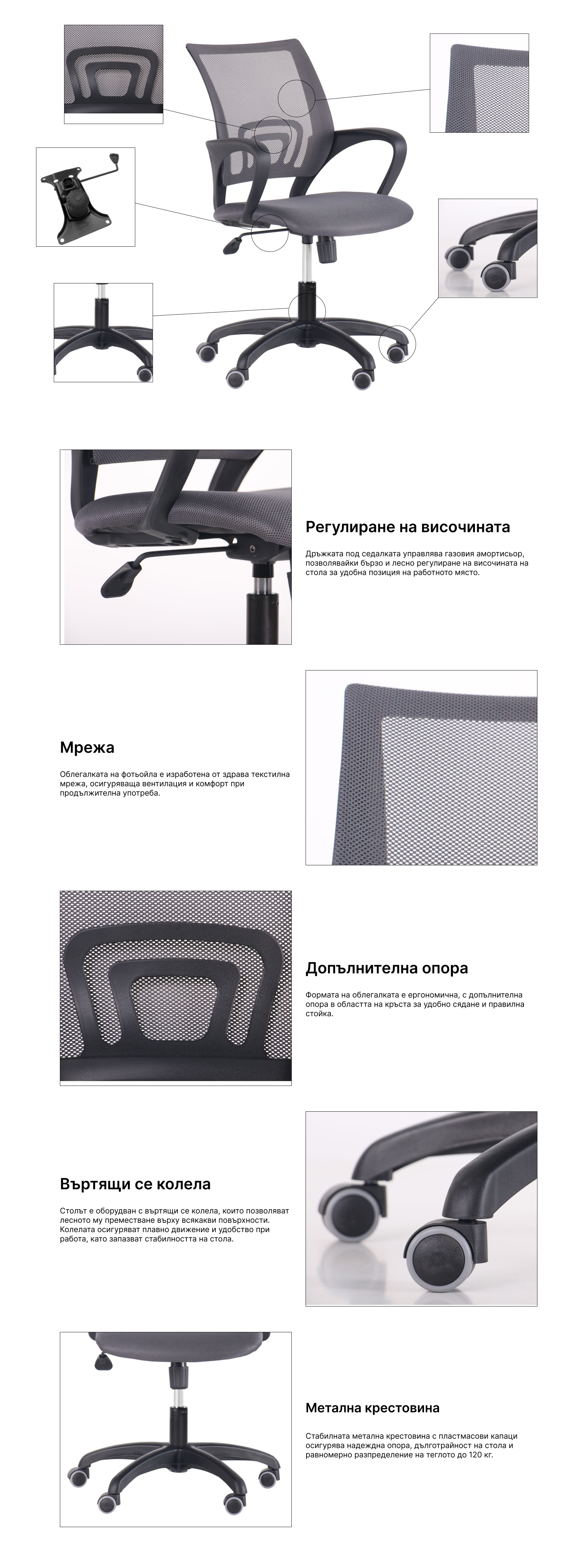 - Облегалката на фотьойла е изработена от здрава текстилна мрежа, осигуряваща вентилация и комфорт при продължителна употреба.